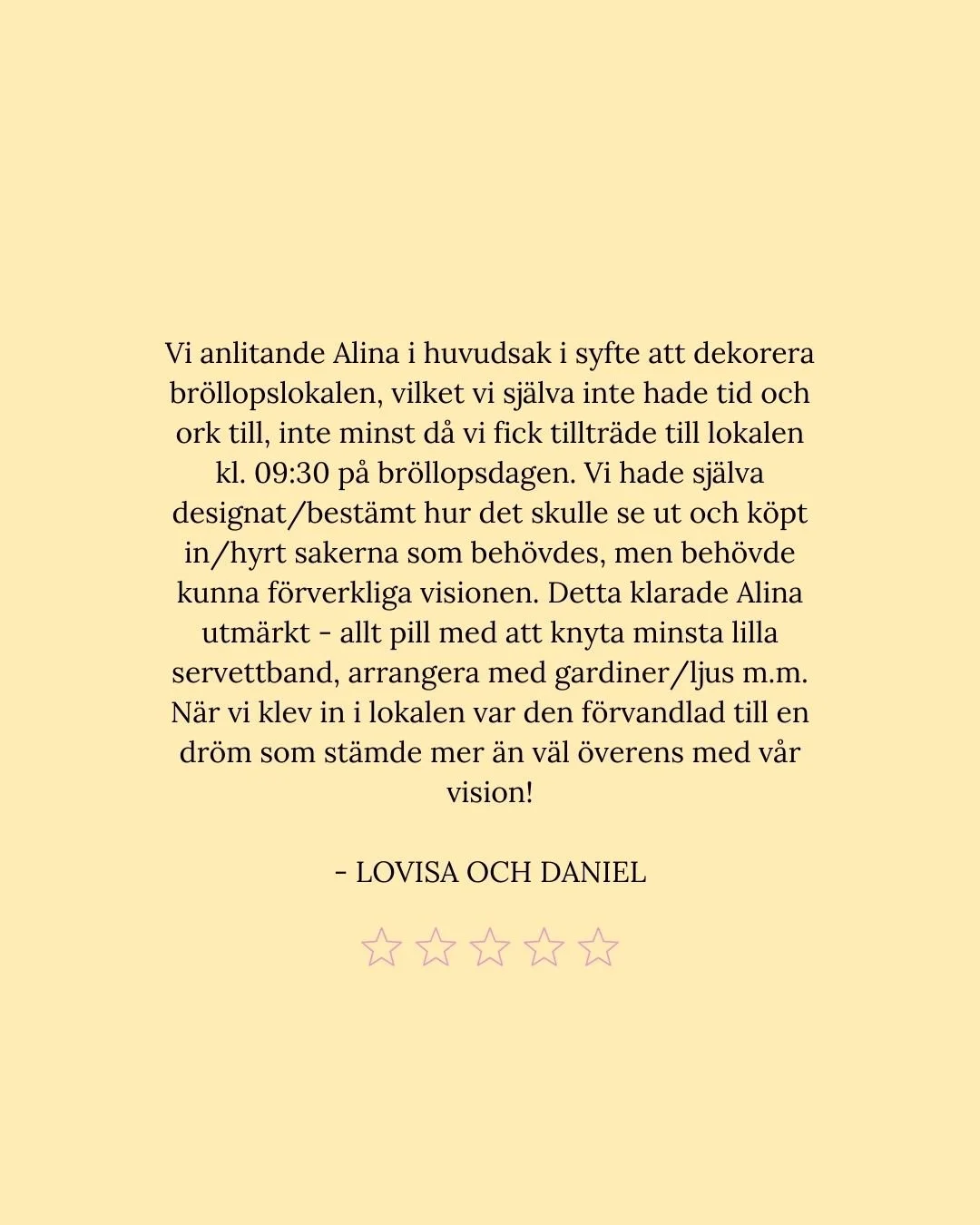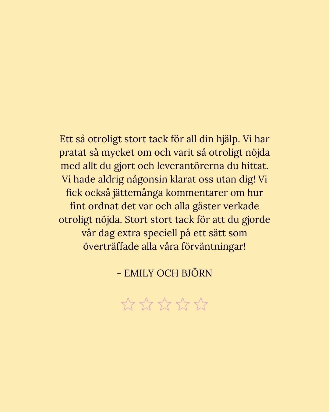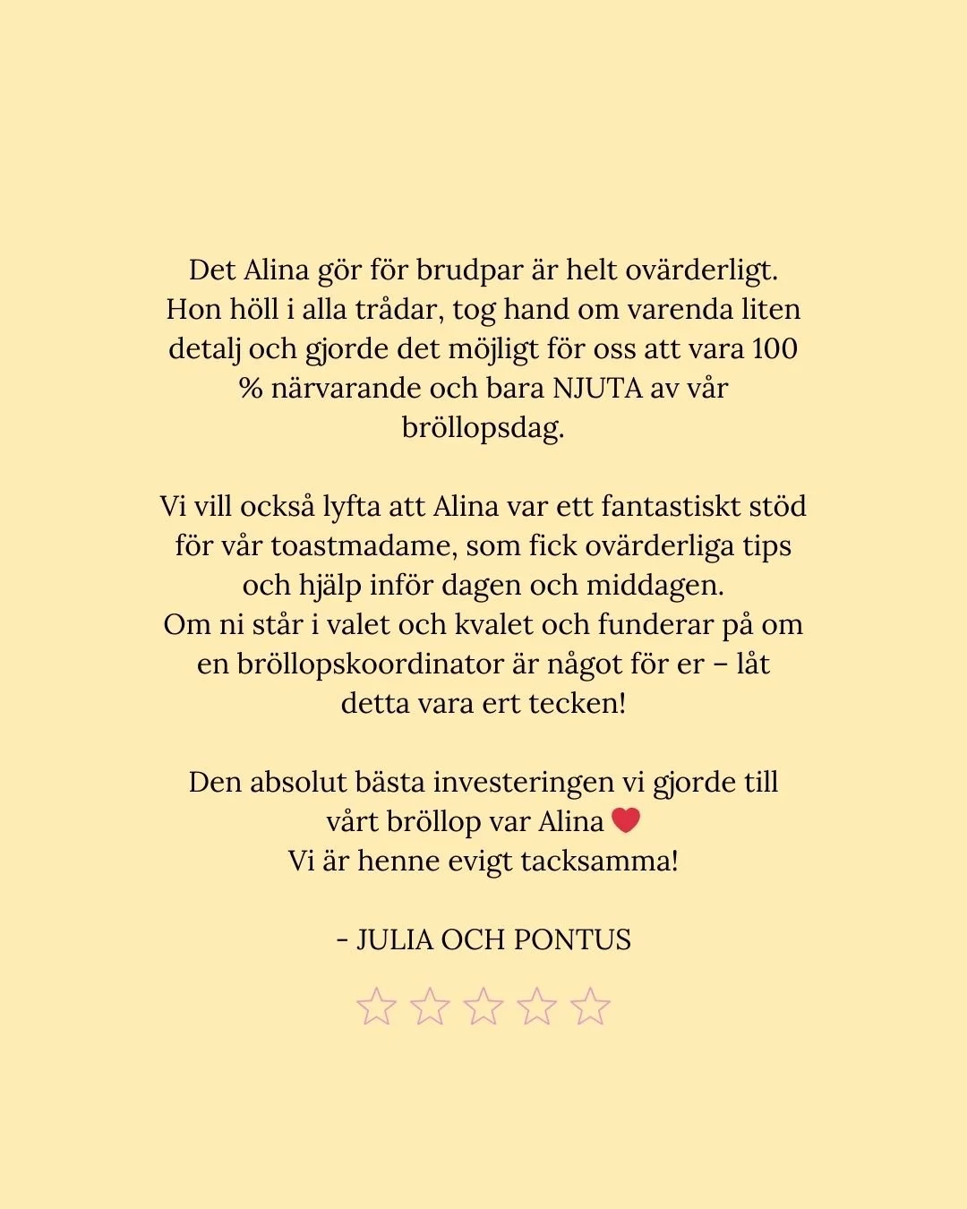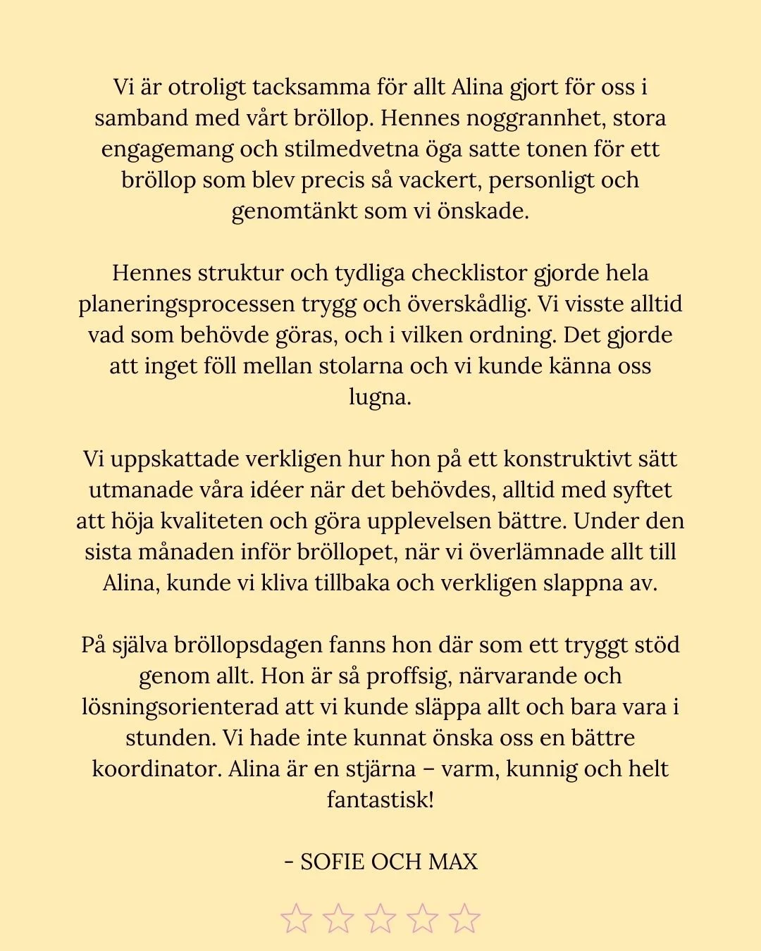 För mig handlar det inte bara om att planera ert bröllop. Det handlar om att förstå er, vad som är viktigt på riktigt, och skapa en dag som känns ni in i varje detalj.
